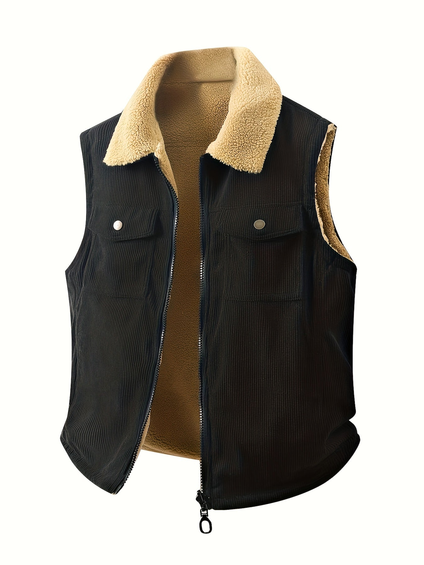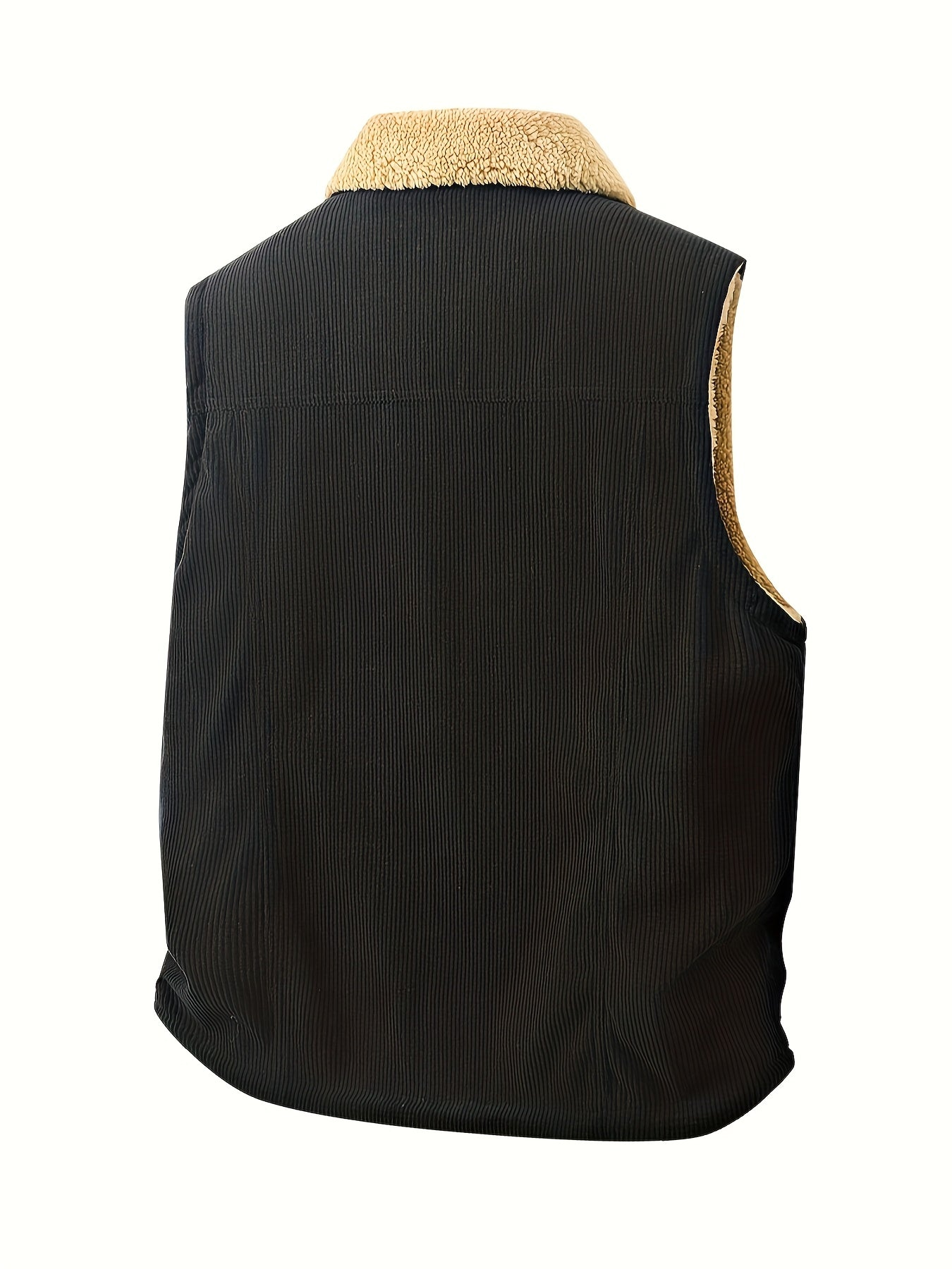 Beschreibung: Ärmellose Kordweste mit breitem Sherpa-Kragen, geradem Schnitt, durchgehendem Frontreißverschluss, Brusttaschen mit Druckknöpfen und einer strukturierten Innenlage.