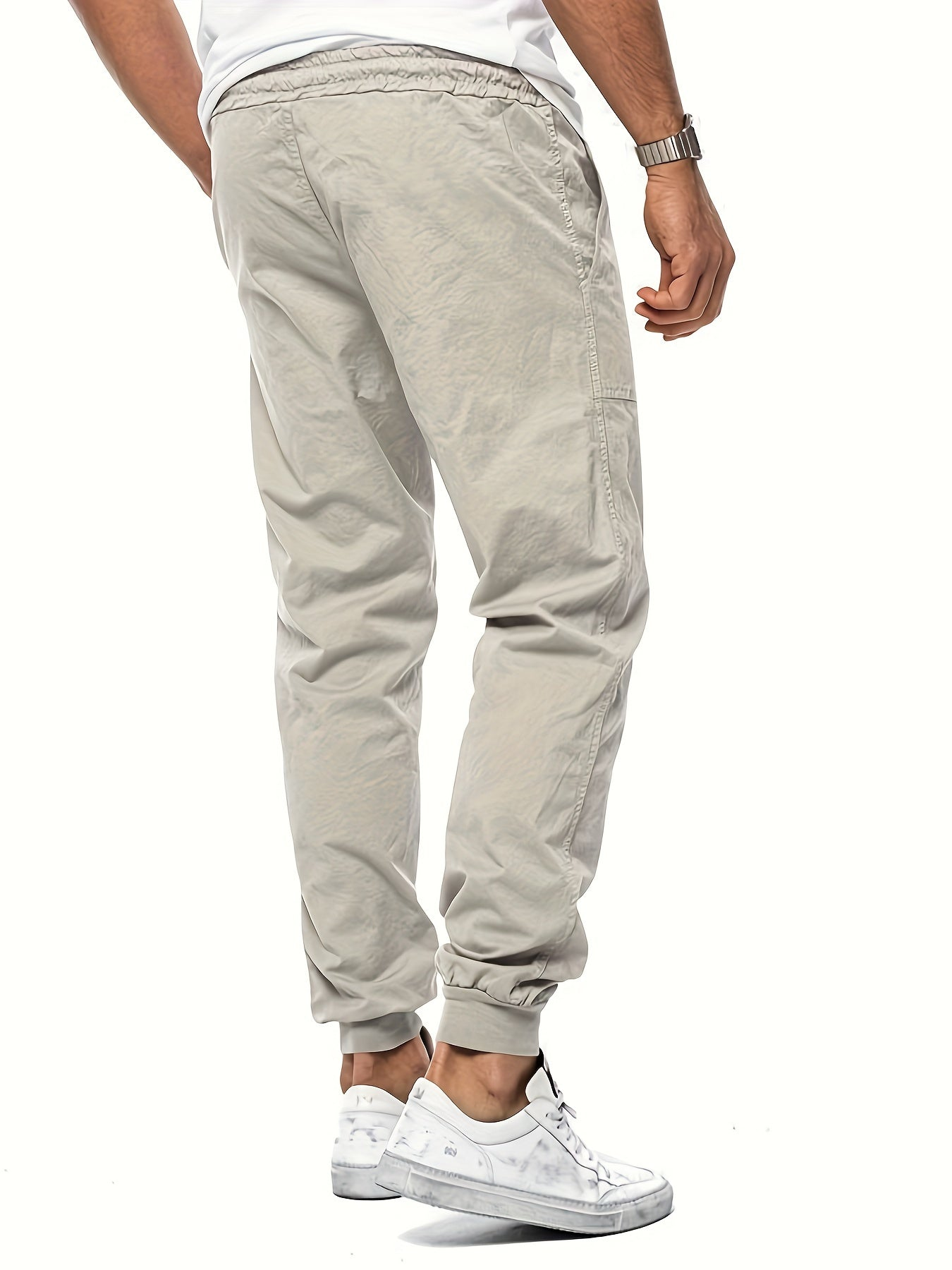 Beschreibung: Hose mit elastischem Bund, Kordelzug vorn, aufgesetzten Taschen, zulaufenden Beinen und gerippten Abschlüssen am Knöchel.